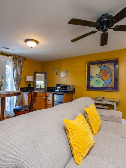 The Loft at Haven is ideal for couples or solo guests looking to reconnect with nature, unwind by the privately-owned lake, and enjoy thoughtful, artfully designed comfort. • 1 beautifully appointed studio: ⎯▹ Studio Loft: 1 Queen bed • Fresh bedding + towels provided • 1 full bathroom • Quality bath essentials provided • Roku TV + streaming in Living Area • Bar area with granite counter • Mini-fridge, bar sink, Toaster oven, Keurig, French press • Dining area for two • Outdoor open-air shower + bathroom • Parking available on site
